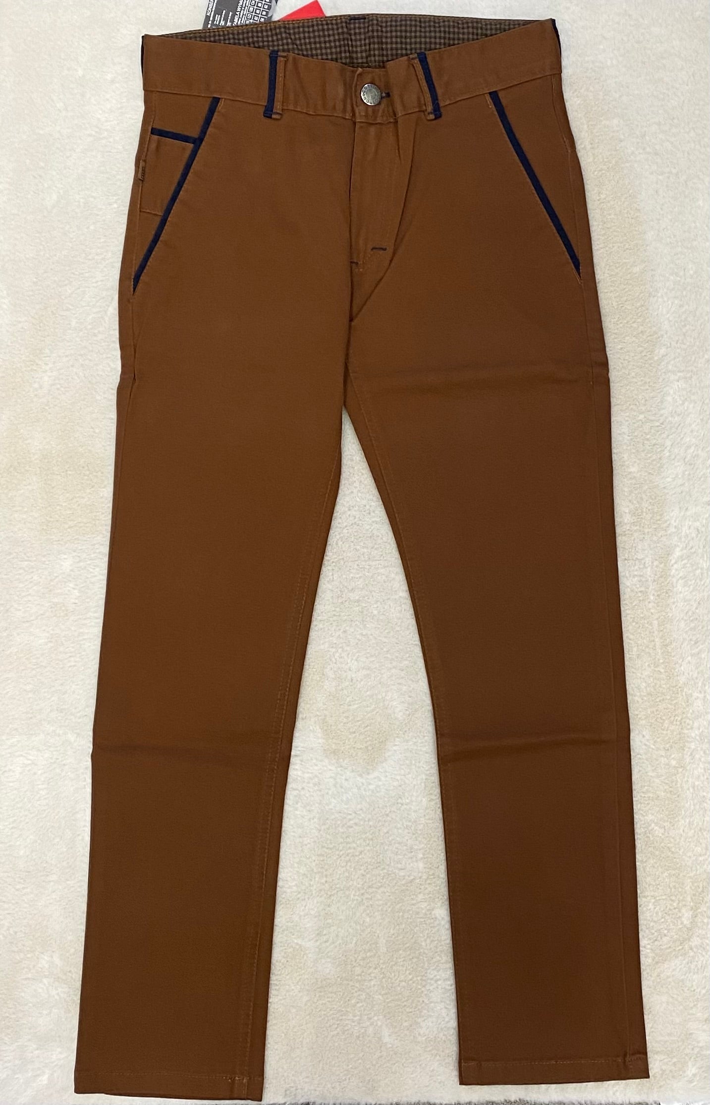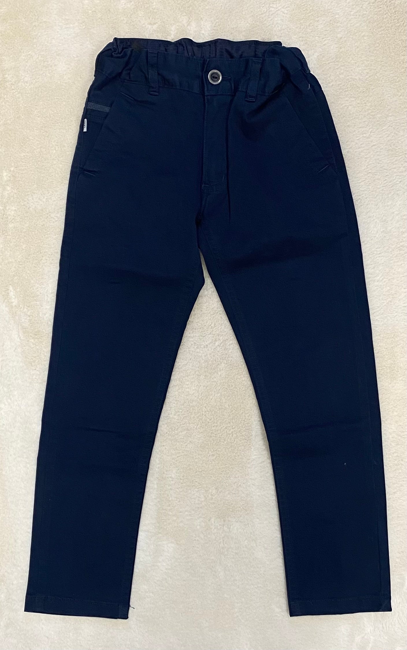 Spodnie na guzik .Gumka ściągana w pasie. Szlufki na pasek..